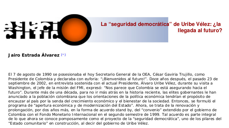 El 7 de agosto de 1990 se posesionaba el hoy Secretario General de la OEA, César Gaviria Trujillo, como Presidente de Colombia y declaraba con euforia: "¡Bienvenidos al futuro!". Doce años después, el pasado 23 de septiembre de 2002, en entrevista sostenida con el actual Presidente, Álvaro Uribe Vélez, durante su visita a Washington, el jefe de la misión del FMI, expresó: "Nos parece que Colombia se está asegurando hacia el futuro". Durante más de una década, para no ir más atrás en la historia reciente, las élites gobernantes le han anunciado a la población colombiana que los orientaciones de la política económica tendrían el propósito de encauzar al país por la senda del crecimiento económico y el bienestar de la sociedad. Entonces, se formuló el programa de "apertura económica y de modernización del Estado". Ahora, se trata de la renovación y prolongación, por dos años más, en la forma de acuerdo stand by, del "convenio" extendido por el gobierno de Colombia con el Fondo Monetario Internacional en el segundo semestre de 1999. Tal acuerdo es parte integral de lo que ahora se conoce pomposamente como el proyecto de la "seguridad democrática", uno de los pilares del "Estado comunitario" en construcción, al decir del gobierno de Uribe Vélez.